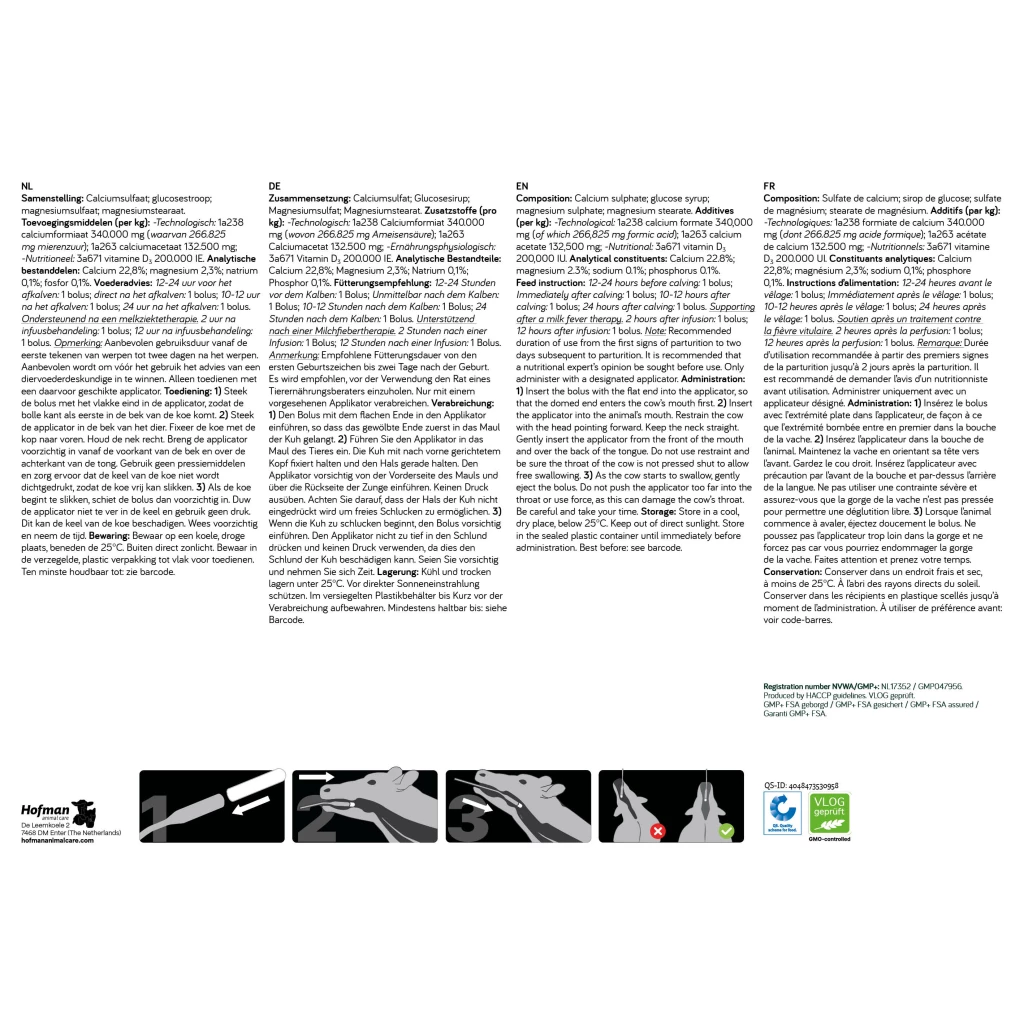 Der DairyCalc Bolus Profi ist eine effektive Kombination aus 49 Gramm Calcium (30 g Schnellwirksam, 19 g Langwirksam), 5 Gramm Magnesium und 49.450 IE Vitamin D3. Perfekt für den Einsatz bei Milchkühen rund um das Kalben, um das Risiko von Milchfieber und subklinischer Hypokalzämie zu reduzieren. Der DairyCalc Bolus Profi ist ein Ergänzungsfuttermittel (Mineraldiätfuttermittel). Einfach zu verabreichen mit dem Eingeber Edelstahl 36 mm (INSE020).