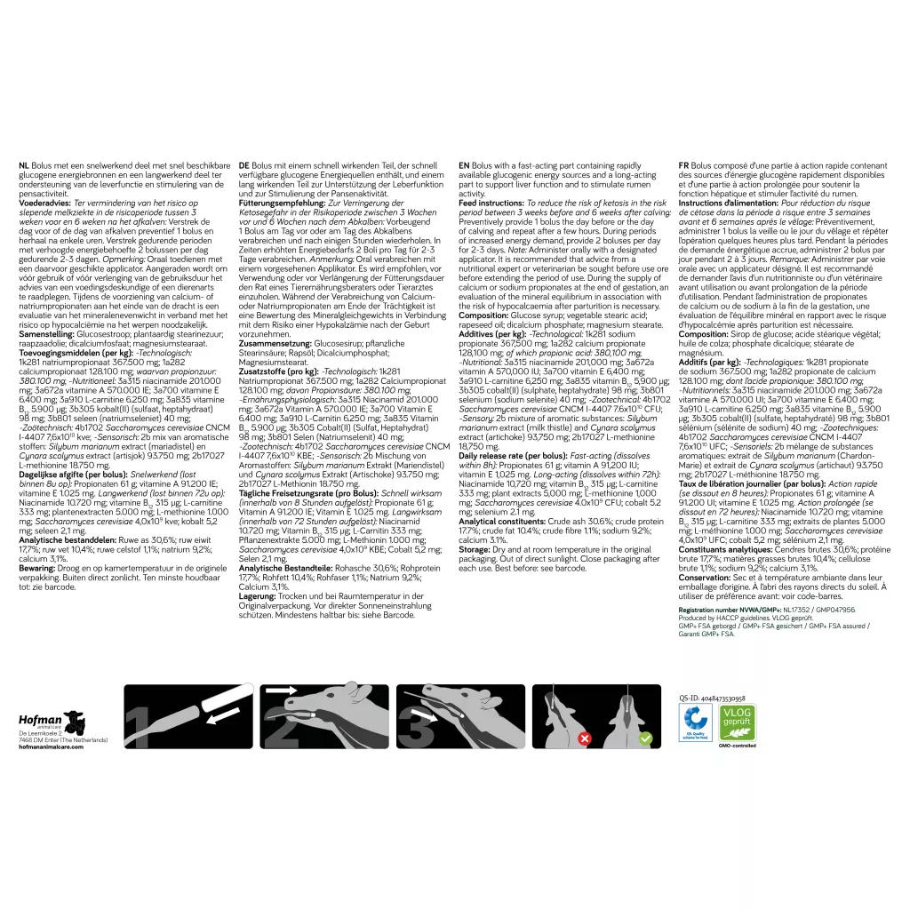 Der DairyEnergy Bolus ist eine Bolus mit einem schnell wirksamen Teil, der leicht verfügbare glucogene Energiequellen (Propionate) enthält, und einem lang wirksamen Teil mit Lebendhefe, Pflanzenextrakte, Vitaminen, Spurenelementen und Aminosäuren zur Unterstützung der Leberfunktion und zur Stimulierung der Pansenaktivität. Auf diese Weise bietet es eine mehrfache Unterstützung, um das Ketosegefahr zu verringern.