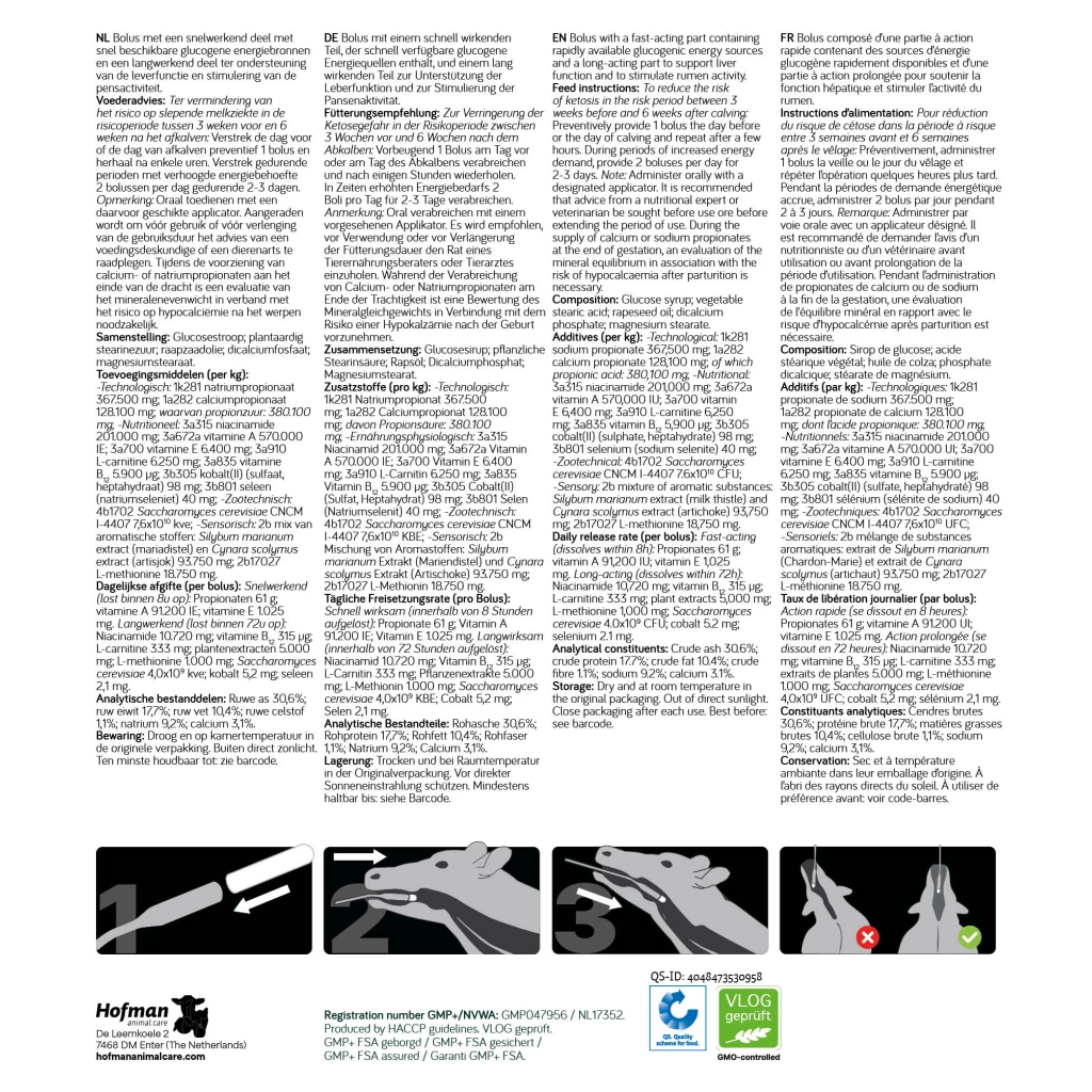 Der DairyEnergy Bolus ist eine Bolus mit einem schnell wirksamen Teil, der leicht verfügbare glucogene Energiequellen (Propionate) enthält, und einem lang wirksamen Teil mit Lebendhefe, Pflanzenextrakte, Vitaminen, Spurenelementen und Aminosäuren zur Unterstützung der Leberfunktion und zur Stimulierung der Pansenaktivität. Auf diese Weise bietet es eine mehrfache Unterstützung, um das Ketosegefahr zu verringern.