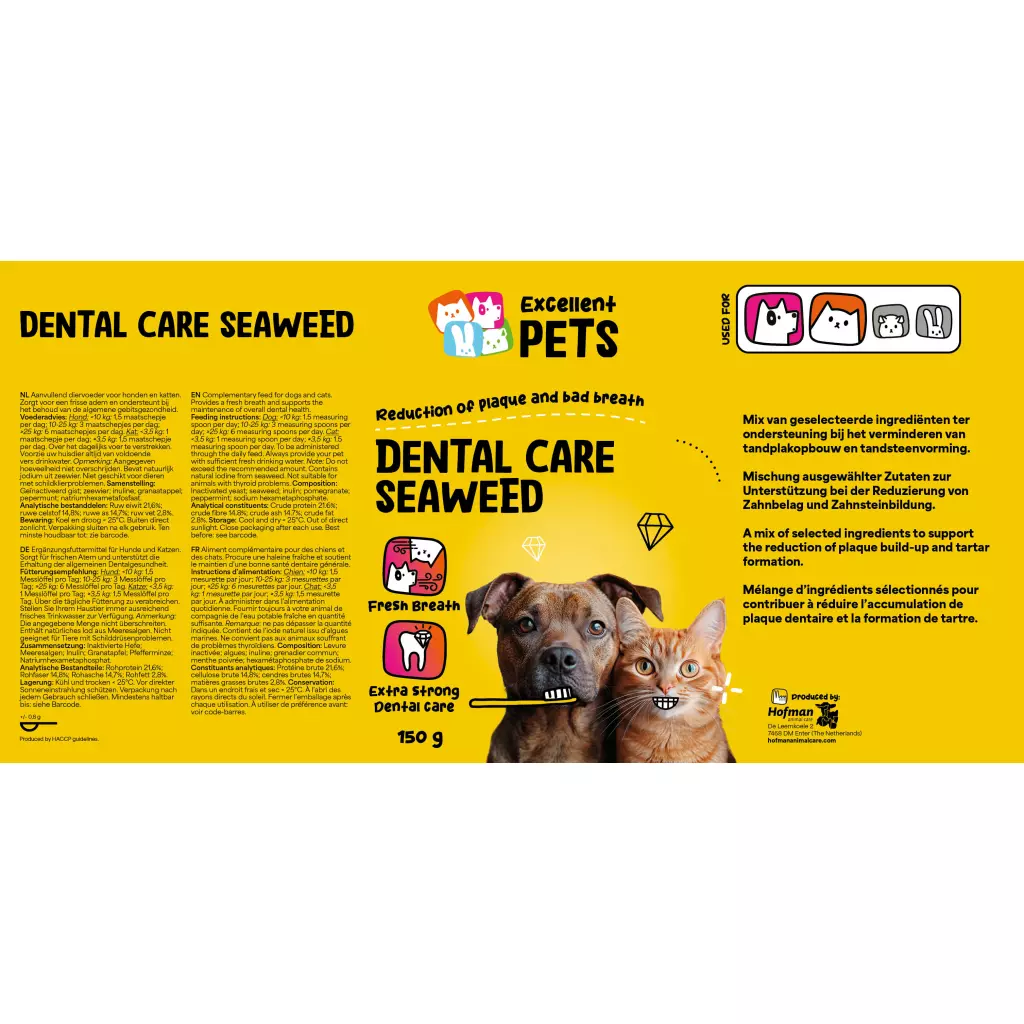 Dental Care Seaweed ist ein Ergänzungsfuttermittel für Hunde und Katzen, das zur Unterstützung einer gesunden Zahn- und Maulhygiene entwickelt wurde. Die Kombination ausgewählter Inhaltsstoffe hilft, die Bildung von Zahnbelag und Zahnstein zu reduzieren, fördert einen frischen Atem und trägt zur allgemeinen Zahngesundheit bei.