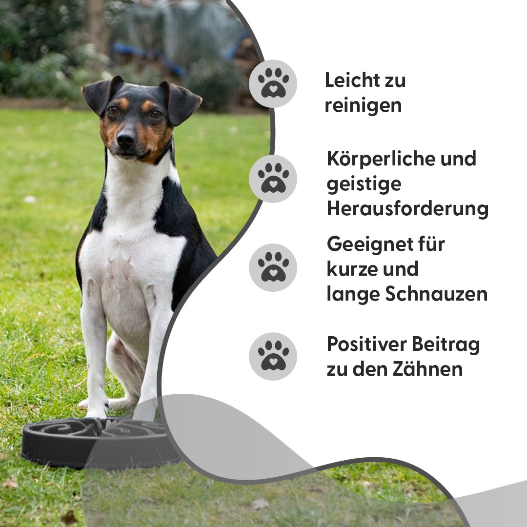 VerwendungVerwenden Sie den Anti-Schlingnapf für die tägliche(n) Portion(en) an Trockenfutter. Verteilen Sie das Trockenfutter gleichmäßig auf dem Futternapf. Dieser Futternapf kann auch für Snacks verwendet werden, so dass der Hund oder die Katze sich anstrengen muss, um das Leckerli zu bekommen.