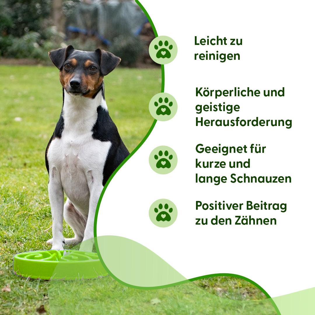 Mit dem Eat Slow Live Longer Original Langsamfresser gehört das Verschlingen der Vergangenheit an! Dieser Futternapf mit Spiralmuster macht es dem Hund oder der Katze schwerer, das Trockenfutter zu erreichen. So nimmt das Tier kleinere Bissen, frisst langsamer und kaut besser. Der Langsamfresser hat rutschfeste Füße auf dem Boden und ist spülmaschinenfest.