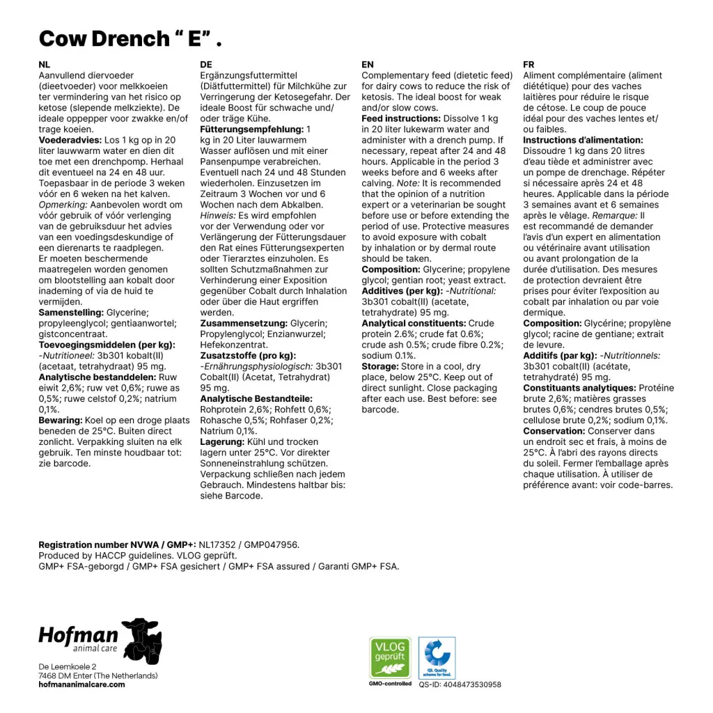 1 kg Cow Drench E in 20 Liter lauwarmem Wasser auflösen und verabreichen über Kuh Drencher (COWD000) oder Drenchmate . Wiederholen Sie diese Dosierung eventuell nach 24 und 48 Stunden.