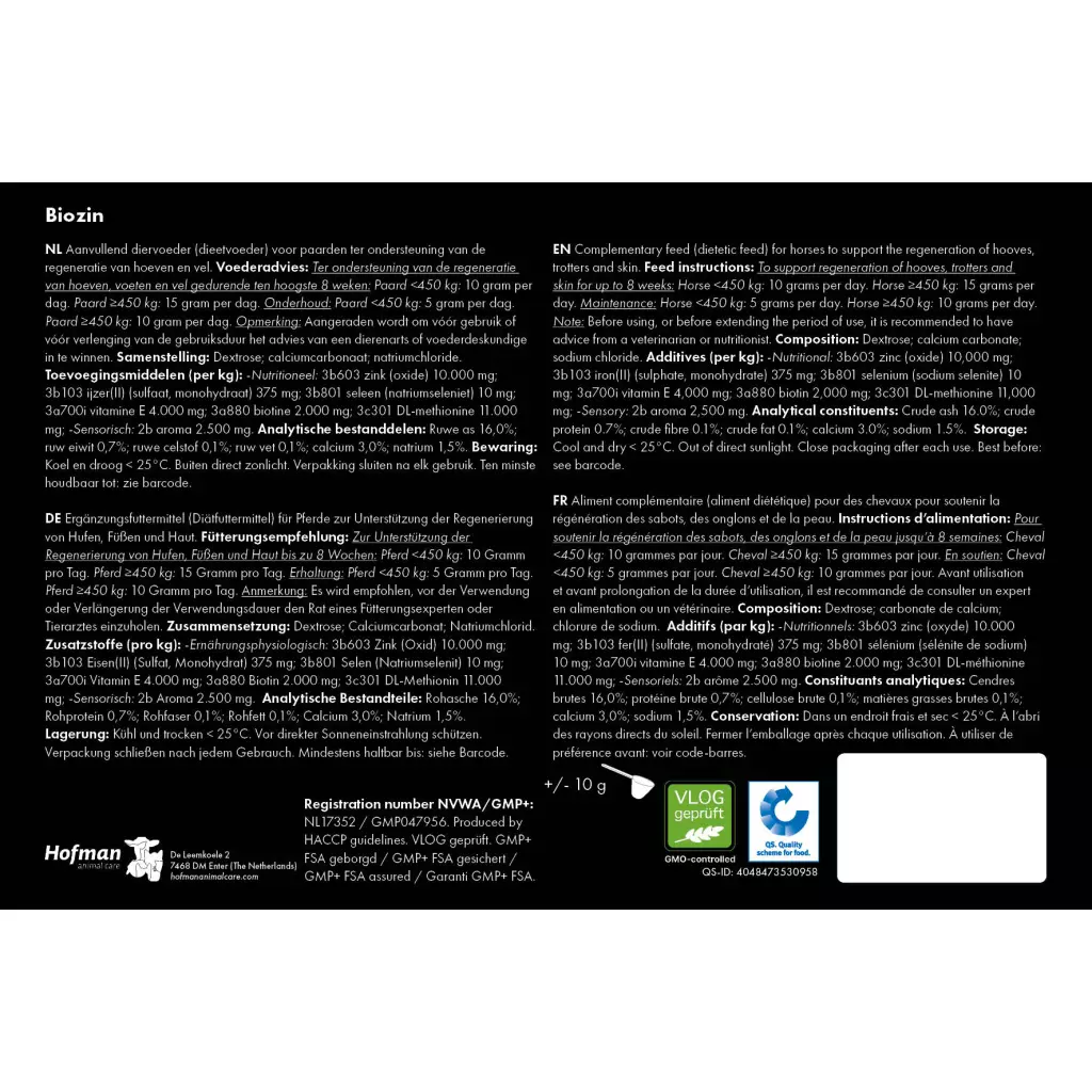 • Biozin zur Unterstützung der Konsistenz und Struktur des Hufhorns, Fells und der Haut des Pferdes.