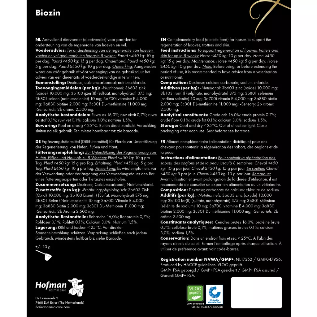 • Biozin zur Unterstützung der Konsistenz und Struktur des Hufhorns, Fells und der Haut des Pferdes.