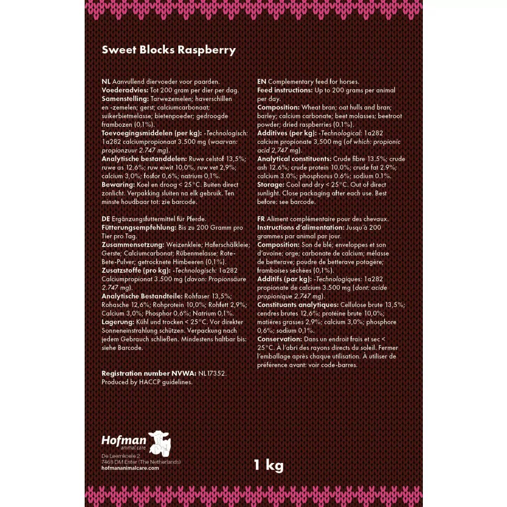 Zutaten:Die Basis der Sweet Blocks besteht aus Weizenkleie, Haferspelzen und Gerste, Getreide, das häufig in Pferdefutter verwendet wird. Außerdem enthalten sie Zuckerrübenmelasse und getrocknete Himbeeren für einen unwiderstehlichen Geschmack.