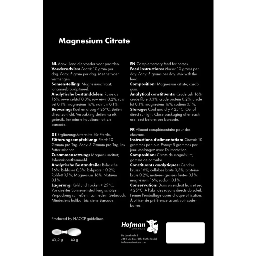 Magnesium ist für den Körper notwendig zur Aufnahme von Kalzium in den Gelenken und beugt vor dass Kalzium in anderen Geweben sich häuft. Vor Allem bei Turnierpferde mit Dauerstress ist Magnesiumcitrat gut geeignet.