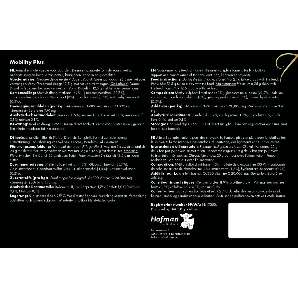 Equi Mobility Plus enthält MSM, Glucosamin, Chondroitin, Grünlippmuschel (Perna canaliculus) und Hyaluronsäure, welche bei Belastung der Gelenke über spezifische, heilende und schützende Eigenschaften verfügt.