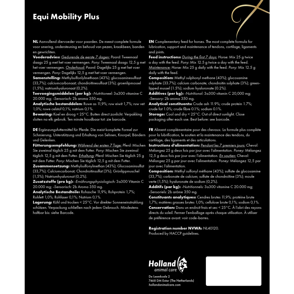 Equi Mobility Plus enthält MSM, Glucosamin, Chondroitin, Grünlippmuschel (Perna canaliculus) und Hyaluronsäure, welche bei Belastung der Gelenke über spezifische, heilende und schützende Eigenschaften verfügt.