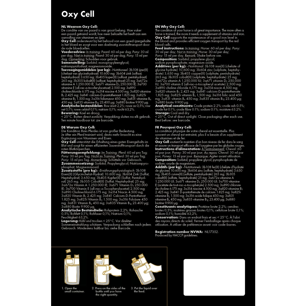 Equi Oxy Cell enthält einen hohen Anteil an Eisen, Vitaminen und Mineralien (u.a. Magnesium). Eisen ist wichtig für einen effizienten Sauerstofftransport zu u.a. den Muskeln. Diesen Transport unterstützt die Erhaltung von Kraft, Widerstandskraft, Energie und Ausdauer.