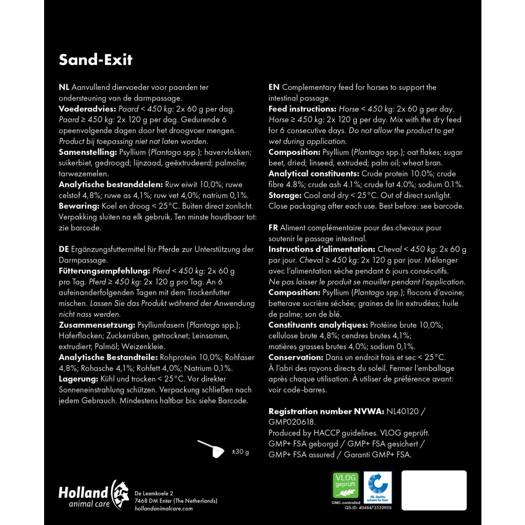 Sand-Exit enthält Ballaststoffreiche Quellen, zum Beispiel Psylliumfasern und extrudierte Leinsamen zur Unterstützung einer guten Darmwirkung.