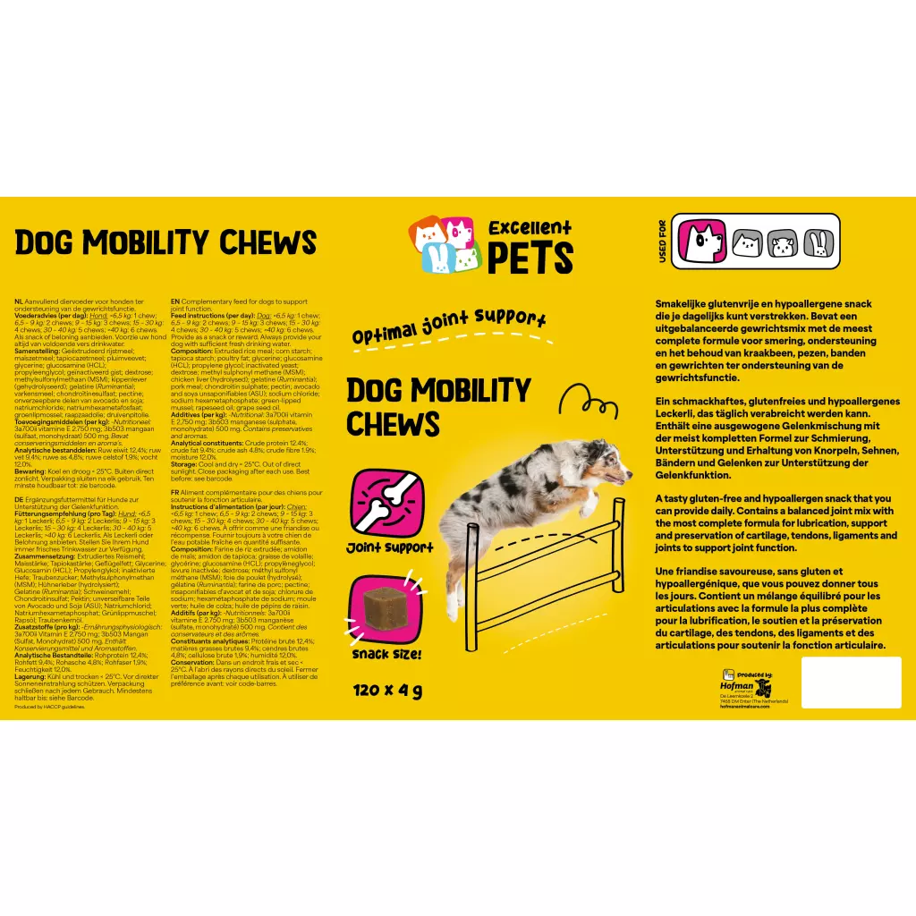 Excellent Pets Dog Mobility Chews ist ein Ergänzungsfuttermittel für Hunde in Form von weichen Kauartikeln. Es enthält eine ausgewogene Gelenkmischung, um Knorpel, Sehnen, Bänder und Gelenke zu schmieren, zu unterstützen und zu erhalten. Außerdem unterstützt es die Gelenkfunktion.