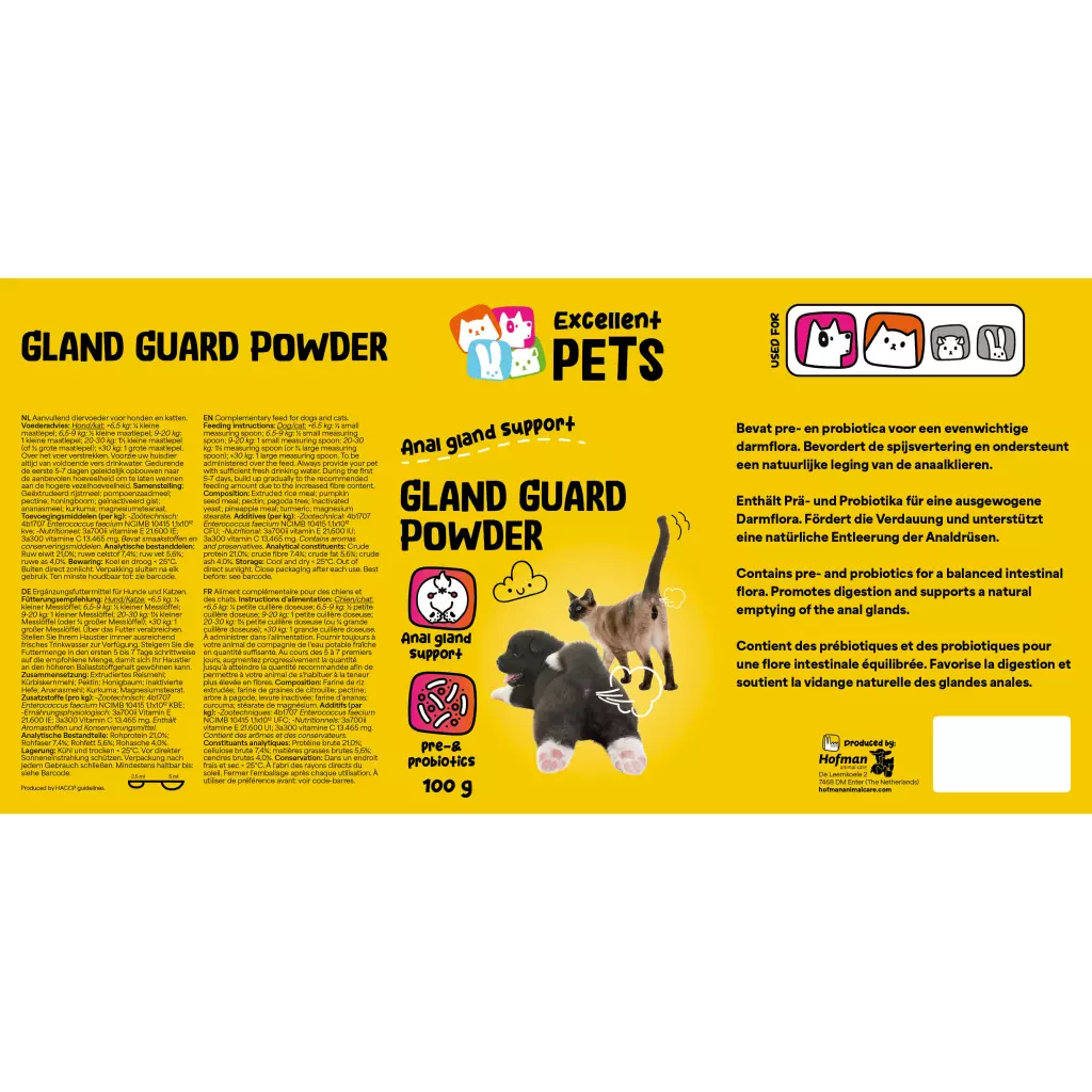 Excellent Pets Gland Guard Pulver ist ein Ergänzungsfuttermittel für Hunde und Katzen in Pulverform. Es enthält Präbiotika und Probiotika, die die natürliche Entleerung der Analdrüsen unterstützen und zu einer gesunden Verdauung sowie einer ausgewogenen Darmflora beitragen.
