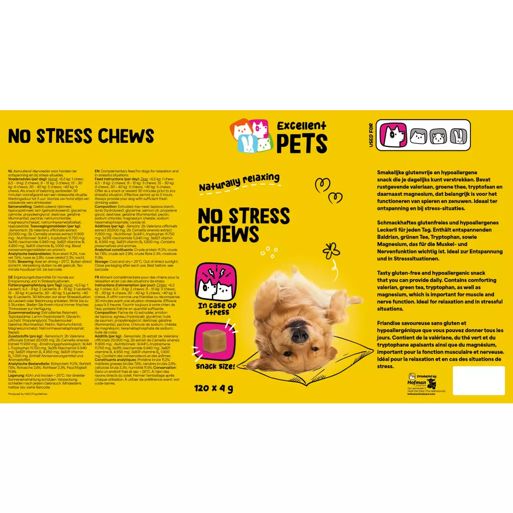 Excellent Pets No Stress Soft Chews ist ein Ergänzungsfuttermittel für Hunde in Form von weichen Kausnacks. Es enthält natürliche, beruhigende Inhaltsstoffe, zur Entspannung und in Stresssituationen und ist bis zu 5 Stunden effektiv.