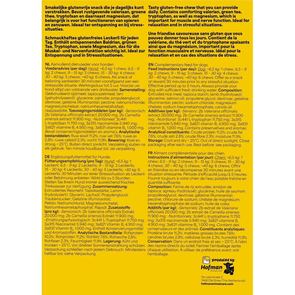 EffektExcellent Pets No Stress Soft Chews enthält L-Tryptophan, Baldrian, grünen Tee und Magnesium. L-Tryptophan ist eine essentielle Aminosäure, die zur Produktion von Serotonin beiträgt, einer Substanz, die ein Gefühl der Ruhe und des Wohlbefindens vermittelt. Dadurch werden die Hunde in stressigen Situationen ruhiger. Magnesium hat eine positive Wirkung auf das Nervensystem und die Muskeln und fördert die Entspannung. Baldrian hat eine beruhigende Wirkung und ist ideal bei Anspannung oder in Stresssituationen. Grüner Tee ist reich an Antioxidantien, die helfen, den Körper vor schädlichen Einflüssen zu schützen.