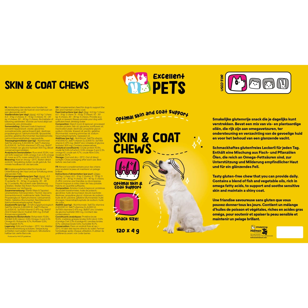 Excellent Pets Skin & Coat Chews ist ein Ergänzungsfuttermittel für Hunde in Form von weichen Kausnacks. Es ist reich an Omega-Fettsäuren zur Unterstützung und Beruhigung empfindlicher Haut und zur Erhaltung eines glänzenden Fells.