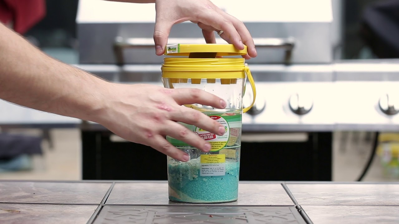 Fügen Sie den Lockstoff und Wasser in den Flybuster Garten. Stellen Sie die Flybusters in und um das Gebiet auf einer Höhe zwischen 120 und 180 cm auf. Die Anzahl der Fliegenfallen ist abhängig von der Größe der Fläche. Sie müssen sicherstellen, dass die Flybusters so gut wie möglich vor Wind geschützt sind.