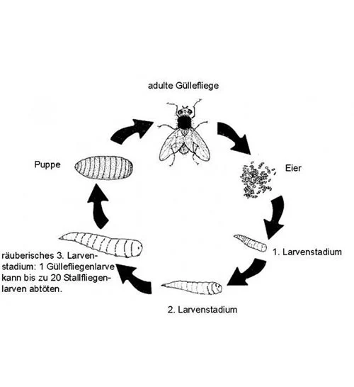 - Die Eier der Güllefliegen einwickeln sich zu Larven und fressen die Larven der Stubenfliege und bekämpfen Stallfliegen