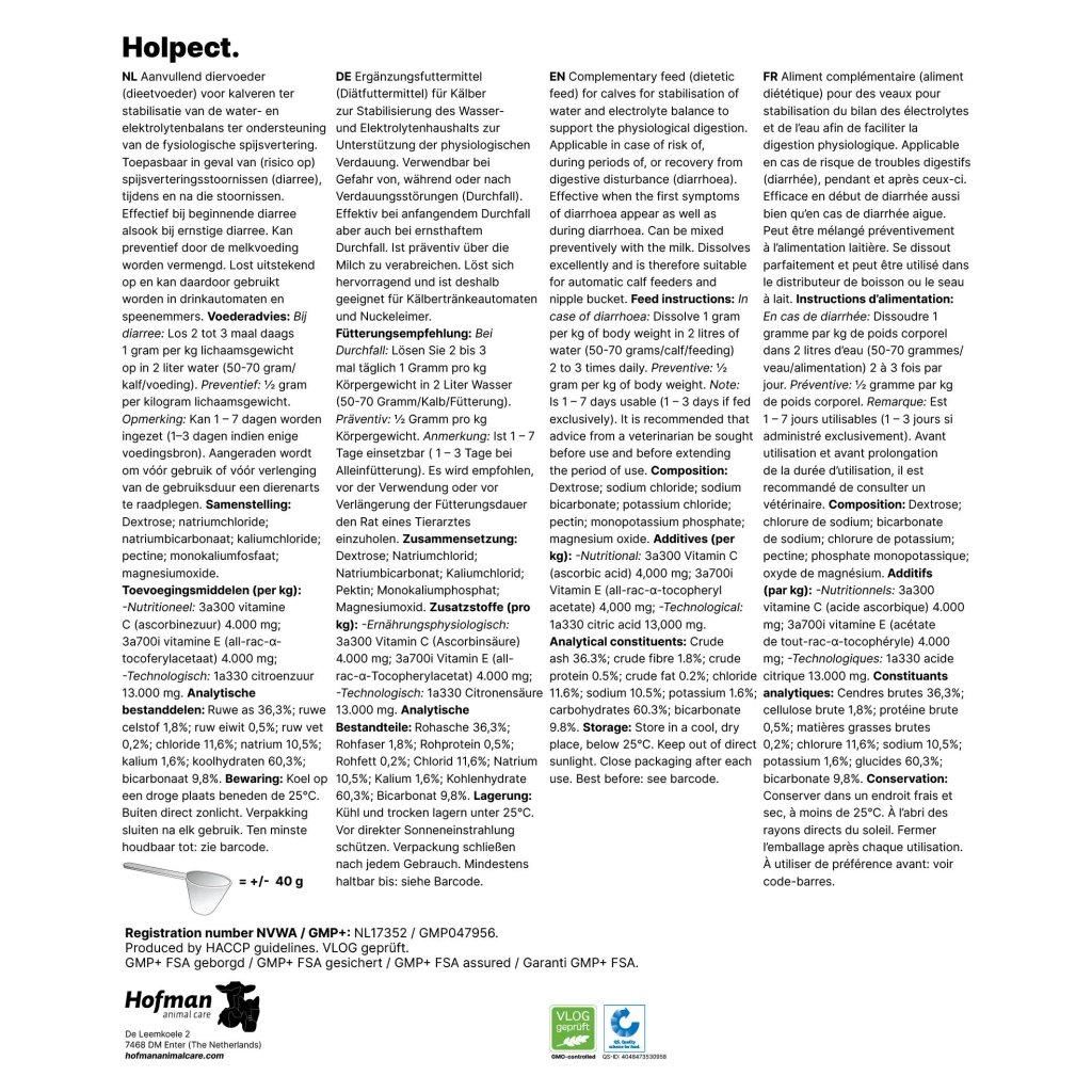 2 bis 3 Mal täglich 1 g Holpect pro kg LG in 2 l Wasser auflösen (50-70 g/Kalb/Futter).