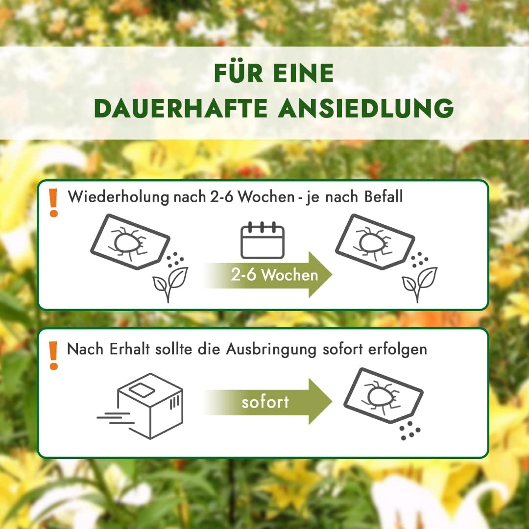 Der Nützlingseinsatz sollte je nach Befall nach etwa 2-6 Wochen wiederholt werden um das beste Resultat zu erhalten und zwar – ein Schädlingsfreies Gebiet.