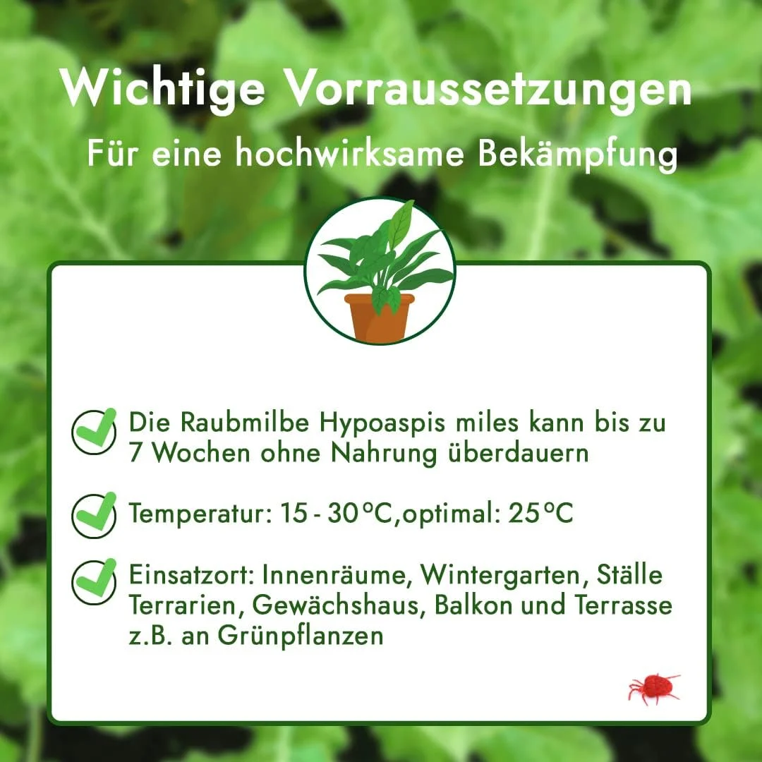 Schon nach wenigen Tagen des Einsatzes unserer Raubmilben ist eine sichtbare Abnahme der Anzahl an Trauermücken, Springschwänze und Thripse zu beobachten. Es kann jedoch einige Wochen dauern, bis die Schädlinge gänzlich verschwunden sind. Bis dahin vermehren sich unsere Raubmilben Hypoaspis miles fleissig weiter. Wenn keine Schädlinge mehr als Beute gefunden werden, gehen sie schließlich aufgrund von Nahrungsmangel ein. Daher sollte der Nützlingseinsatz je nach Befall nach etwa 2-6 Wochen wiederholt werden.