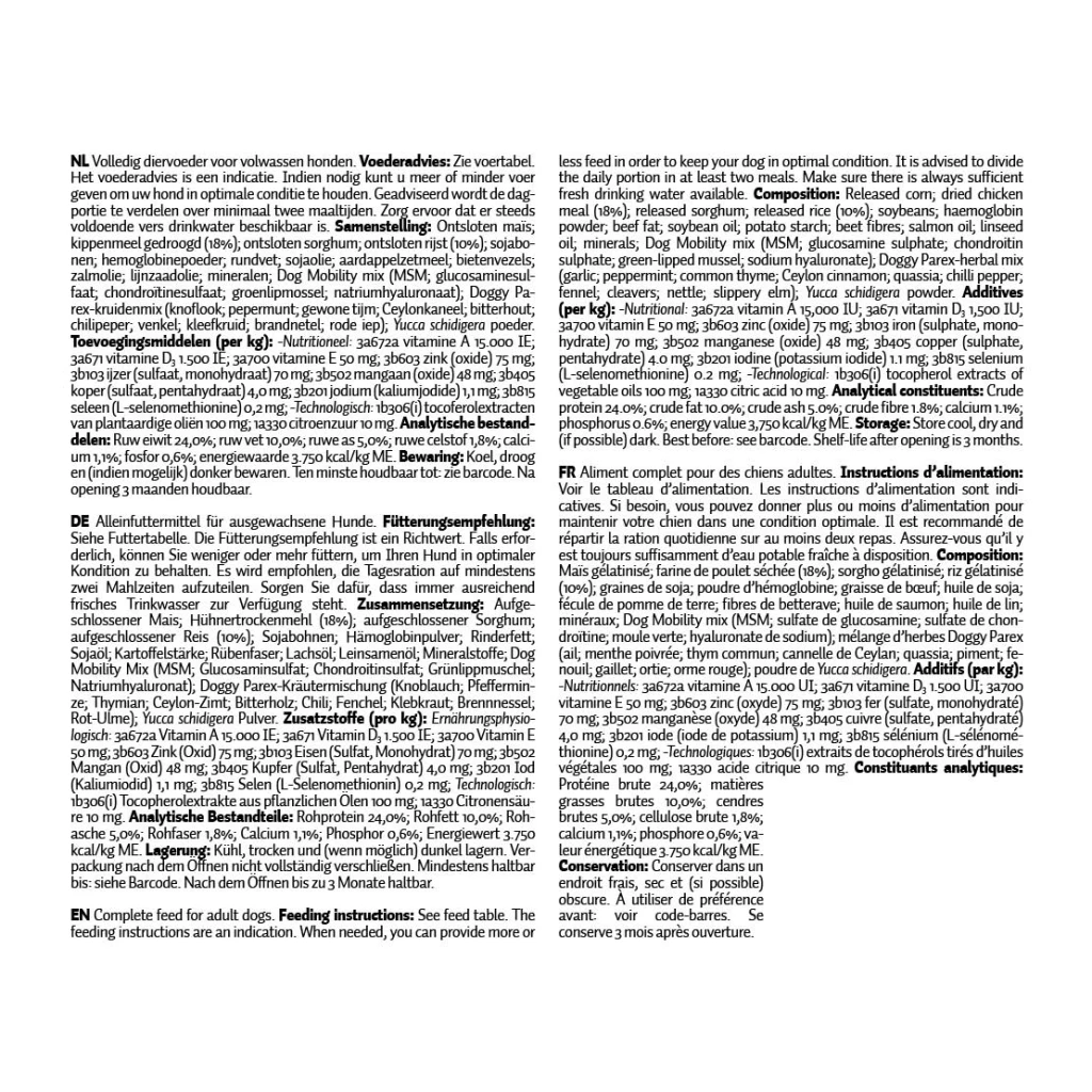 Max Adult enthält Doggy Parex zur Unterstützung der Darmflora. Doggy Parex ist ein 100% natürliches Reinigungsprodukt für das Verdauungssystem und die Darmflora. Es erhöht die Widerstandskraft, hilft, die Darmflora in optimalem Zustand zu halten und lässt das Fell schön glänzen. Dieses Ergänzungsfuttermittel enthält unter anderem Knoblauch, Pfefferminze, Thymian und Fenchel.