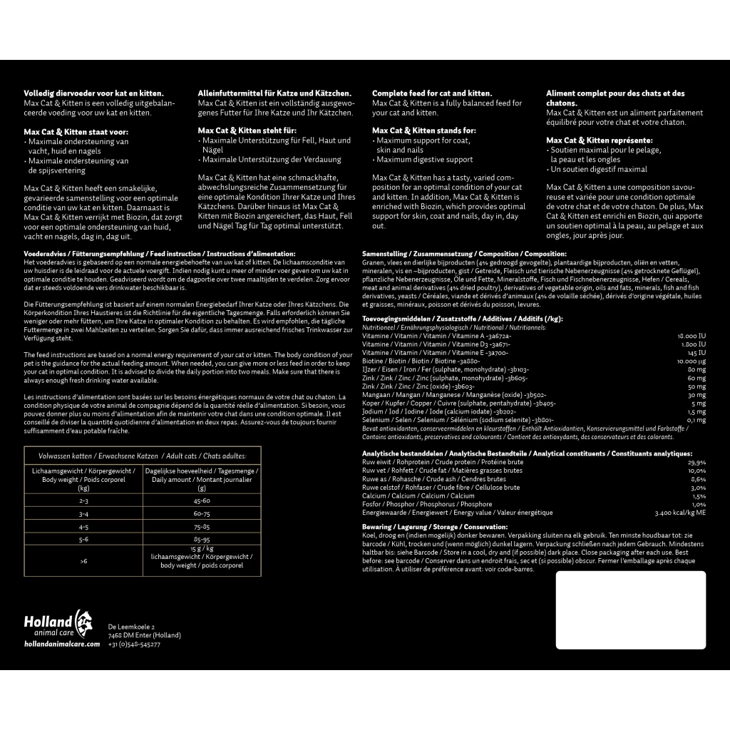 Max Cat and Kitten ist ein Super-Premium-Plus-Futter in Pelletform und enthält hochwertige Zutaten. Durch die Zugabe des Nahrungsergänzungsmittels Biozin ist Max Cat and Kitten das kompletteste Futter für Katzen und Kätzchen.