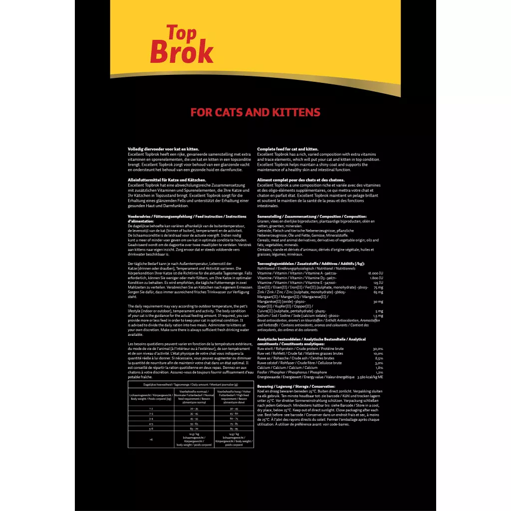 Excellent Topbrok hat eine abwechslungsreiche Zusammensetzung mit zusätzlichen Vitaminen und Spurenelementen, die Ihre Katze oder Ihr Kätzchen in Topzustand bringt.